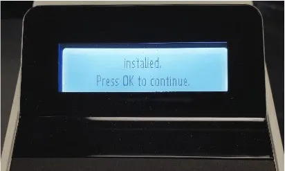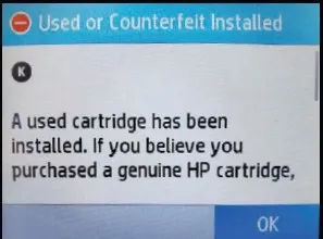 When you first install the cartridge, you will see the message, “Used or counterfeit cartridges”.