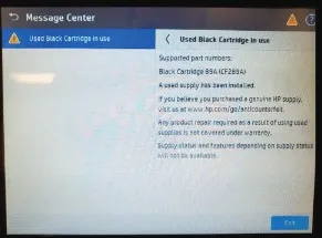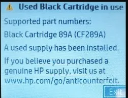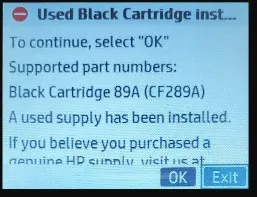 When you first install the cartridge, you will see the message, “Used Cartridges”.