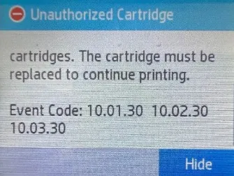 Recommended Solution: Turn off “Authorized HP” under cartridge policy. Setup > Supply Settings > Cartridge Policy > Off